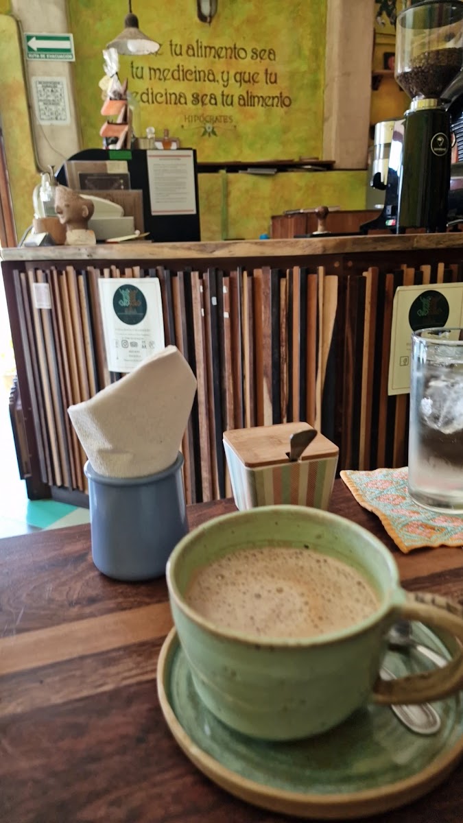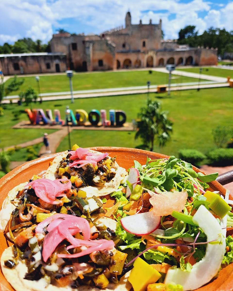 The first thing to notice is the incredible art on the walls and then the cozy furniture. After we got our food we thought it wasn’t going to be enough (coming from an American of course) but the bread was so hearty and whole that we almost couldn’t finish it. I love how they make everything from scratch and most of it comes directly from their farm. The bread made from Ramon seeds was probably the best I’ve ever eaten. The tahini latte was very different from anything I have tried, a tiny bit of saltiness that I wasn’t expecting, but with some of their honey it was absolutely divine. My friend had the pancakes and said they were so good he couldn’t believe they were healthy. I am sad I didn’t go until my last day in Valladolid because I already want to taste the amazing bread again
